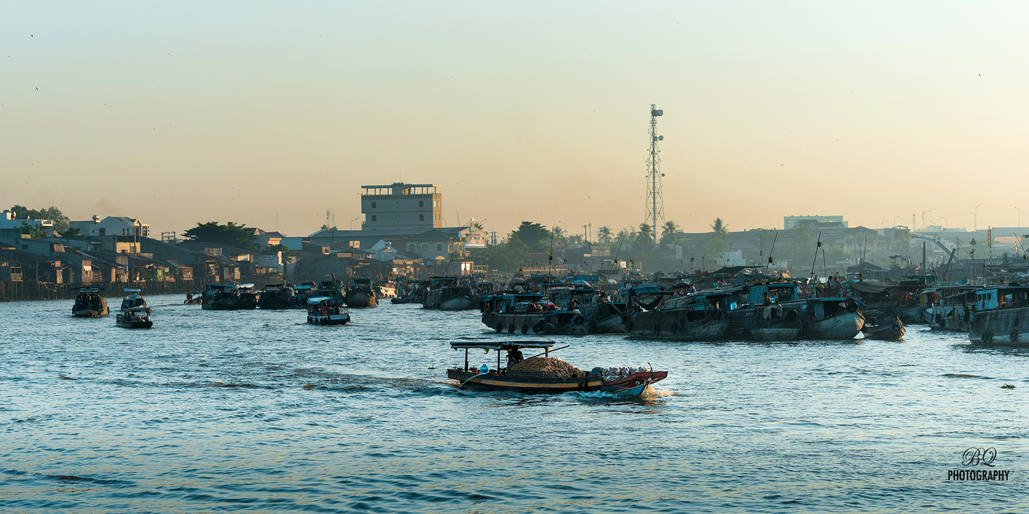 Sunrise is up horizontally about 5:15 a.m in a charming morning at a branch of Mekong river. A new day starts peacefully with hundereds of motor boats and sampans moving back and fro at the floating markets in the river. Each boat is containing variety of tropical fruits, food or vegetables to purchase. The floating markets are daily crowded from the early morning until noon time. This life style has become a relic of Mekong life. Simply, every little thing can make a tremendous love here. It can not be missed for a photography trip at this place.